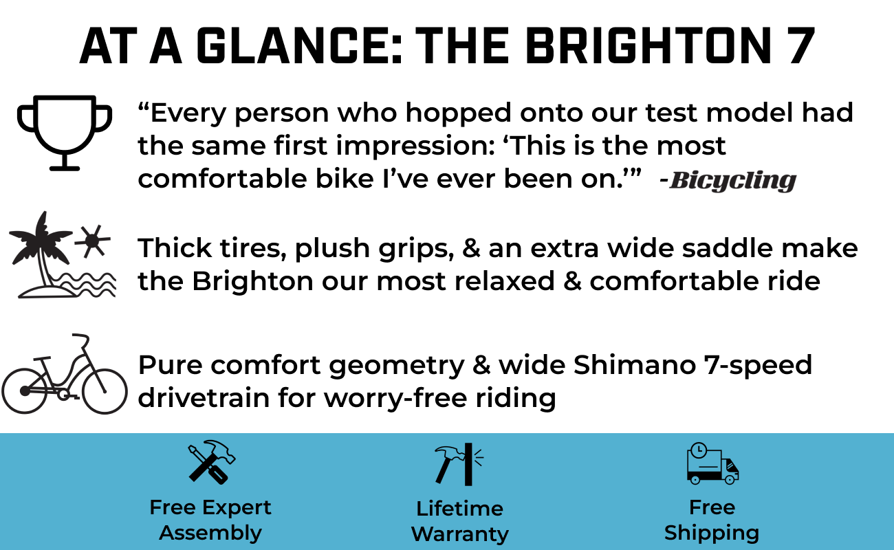 Thick cruiser tires, plush grips, and an extra wide saddle make the Brighton our most relaxed and comfortable ride.